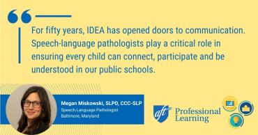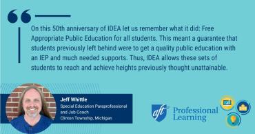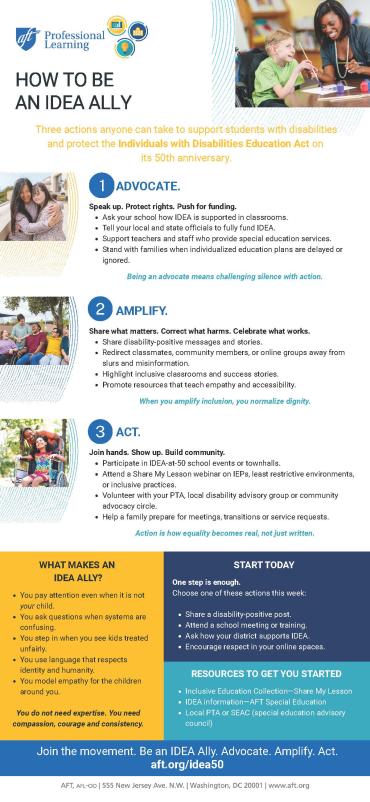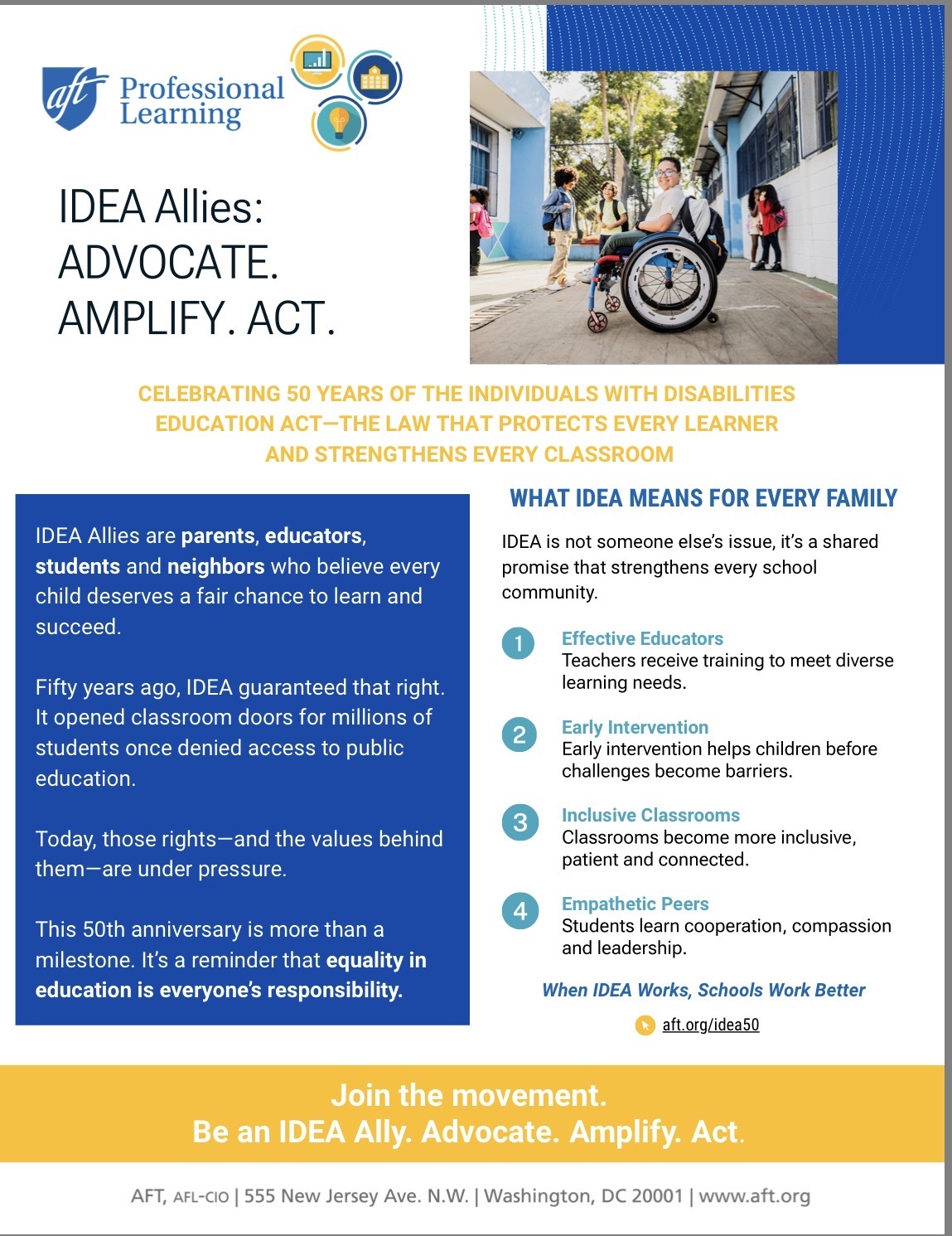 As we honor IDEA’s 50th anniversary, the AFT recommits to the work ahead: securing full funding, strengthening inclusive practices, supporting the educators who make this work possible, and ensuring that all students with a disability receive the high-quality, individualized education they deserve. IDEA is both a milestone and a mandate; our collective responsibility is to fulfill its promise for the next generation.